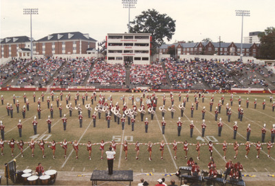 The Jacksonville State University Marching Southerners and Ballerinas perform during a 1992 performance in the Paul Snow Stadium in Jacksonville, AL. The 1992 show featured "Channel One Suite," "La Suerte de Los Tontos" from Cuban Fire Suite, and "Variations on a Shaker Melody" from Appalachian Spring. The band was under the direction of Dr. Scott McBride and the field direction of drum major Chad Hannah. (circa Fall 1992)