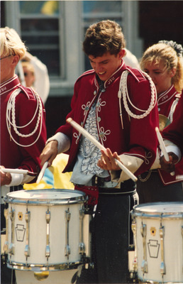 These students were members of The Marching Southerners percussion section at Jacksonville State University in 1993-1994. Shown in uniform they perform outside on the JSU campus quad. The band was under the direction of Dr. Scott McBride and the field direction of drum majors Keith Casey and Marcus LeGear. (circa Fall 1993)