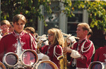 These students were members of The Marching Southerners at Jacksonville State University in 1993-1994. Shown in uniform they perform outside on the JSU campus quad. The band was under the direction of Dr. Scott McBride and the field direction of drum majors Keith Casey and Marcus LeGear. (circa Fall 1993)