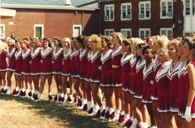 These students were members of The Marching Southerners ballerinas at Jacksonville State University in 1993-1994. Shown in uniform they perform outside on the JSU campus quad. The band was under the direction of Dr. Scott McBride and the field direction of drum majors Keith Casey and Marcus LeGear. (circa Fall 1993)