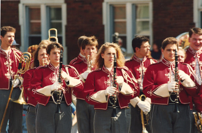 These students were members of The Marching Southerners at Jacksonville State University in 1993-1994. Shown in uniform they perform outside on the JSU campus quad. The band was under the direction of Dr. Scott McBride and the field direction of drum majors Keith Casey and Marcus LeGear. (circa Fall 1993)