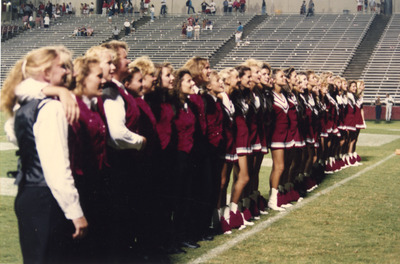 The Jacksonville State University Marching Southerners color guard and ballerinas sing "I'll Fly Away" after a 1993 football game performance in the Paul Snow Stadium in Jacksonville, AL. The band was under the direction of Dr. Scott McBride and the field direction of drum majors Keith Casey and Marcus LeGear. (circa Fall 1993)