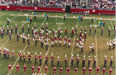 The Jacksonville State University Marching Southerners perform on the field during a 1993 football game performance in the Paul Snow Stadium in Jacksonville, AL. The band was under the direction of Dr. Scott McBride and the field direction of drum majors Keith Casey and Marcus LeGear. (circa Fall 1993)