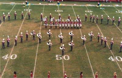 The Jacksonville State University Marching Southerners perform on the field during a 1993 football game performance in the Paul Snow Stadium in Jacksonville, AL. The band was under the direction of Dr. Scott McBride and the field direction of drum majors Keith Casey and Marcus LeGear. (circa Fall 1993)