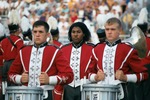 The Jacksonville State University Marching Southerners perform during a Fall 2000 performance, possibly a band exhibition performance at Tuscaloosa County High School in Northport, AL. The 2000 show title was "A Night in Birdland." Opener was "Birdland," the ballerina tune was "Night in Tunisia/Harlem Nocturne," and the closer was "Strawberry Soup." The band was under the direction of Kenneth G. Bodiford. Shown are members of the drumline. (before October 2000)