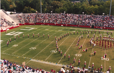 The Jacksonville State University Marching Southerners perform on the field during a 1993 football game performance in the Paul Snow Stadium in Jacksonville, AL. The band was under the direction of Dr. Scott McBride and the field direction of drum majors Keith Casey and Marcus LeGear. (circa Fall 1993)
