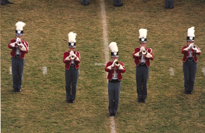 The Jacksonville State University Marching Southerners perform on the field during a 1993 football game performance in the Paul Snow Stadium in Jacksonville, AL. The band was under the direction of Dr. Scott McBride and the field direction of drum majors Keith Casey and Marcus LeGear. (circa Fall 1993)