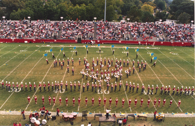 The Jacksonville State University Marching Southerners perform on the field during a 1993 football game performance in the Paul Snow Stadium in Jacksonville, AL. The band was under the direction of Dr. Scott McBride and the field direction of drum majors Keith Casey and Marcus LeGear. (circa Fall 1993)