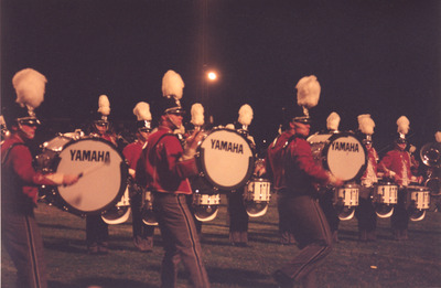The Jacksonville State University Marching Southerners perform during a Fall 1993 performance, possibly a band exhibition performance. The band was under the direction of Dr. Scott McBride and the field direction of drum majors Keith Casey and Marcus LeGear. (circa Fall 1993)