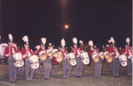 The Jacksonville State University Marching Southerners perform during a Fall 1993 performance, possibly a band exhibition performance. The band was under the direction of Dr. Scott McBride and the field direction of drum majors Keith Casey and Marcus LeGear. (circa Fall 1993)