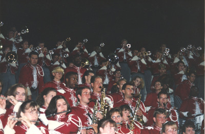 The Jacksonville State University Marching Southerners perform during a Fall 1993 performance, possibly a band exhibition performance. The band was under the direction of Dr. Scott McBride and the field direction of drum majors Keith Casey and Marcus LeGear. (circa Fall 1993)
