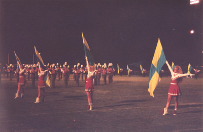 The Jacksonville State University Marching Southerners perform during a Fall 1993 performance, possibly a band exhibition performance. The band was under the direction of Dr. Scott McBride and the field direction of drum majors Keith Casey and Marcus LeGear. (circa Fall 1993)