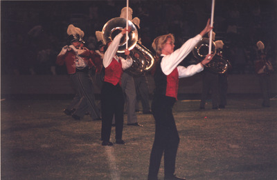 The Jacksonville State University Marching Southerners perform during a Fall 1993 performance, possibly a band exhibition performance. The band was under the direction of Dr. Scott McBride and the field direction of drum majors Keith Casey and Marcus LeGear. (circa Fall 1993)