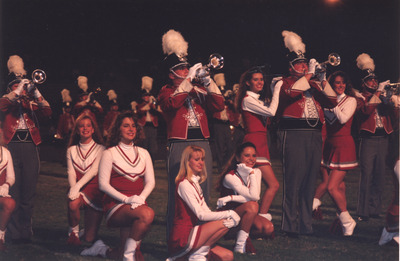 The Jacksonville State University Marching Southerners perform during a Fall 1993 performance, possibly a band exhibition performance. The band was under the direction of Dr. Scott McBride and the field direction of drum majors Keith Casey and Marcus LeGear. (circa Fall 1993)