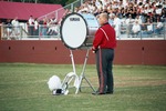 The Jacksonville State University Marching Southerners perform during a Fall 2000 performance, possibly a band exhibition performance at Tuscaloosa County High School in Northport, AL. The 2000 show title was "A Night in Birdland." Opener was "Birdland," the ballerina tune was "Night in Tunisia/Harlem Nocturne," and the closer was "Strawberry Soup." The band was under the direction of Kenneth G. Bodiford. Shown is a member of the drumline. (before October 2000)