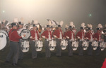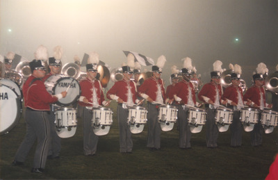 The Jacksonville State University Marching Southerners perform during a Fall 1993 performance, possibly a band exhibition performance. The band was under the direction of Dr. Scott McBride and the field direction of drum majors Keith Casey and Marcus LeGear. (circa Fall 1993)