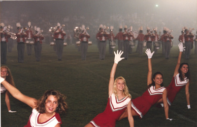 The Jacksonville State University Marching Southerners perform during a Fall 1993 performance, possibly a band exhibition performance. The band was under the direction of Dr. Scott McBride and the field direction of drum majors Keith Casey and Marcus LeGear. (circa Fall 1993)