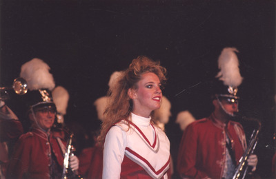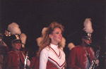 The Jacksonville State University Marching Southerners perform during a Fall 1993 performance, possibly a band exhibition performance. The band was under the direction of Dr. Scott McBride and the field direction of drum majors Keith Casey and Marcus LeGear. (circa Fall 1993)