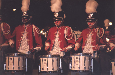 The Jacksonville State University Marching Southerners perform during a Fall 1993 performance, possibly a band exhibition performance. The band was under the direction of Dr. Scott McBride and the field direction of drum majors Keith Casey and Marcus LeGear. (circa Fall 1993)