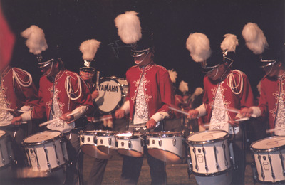 The Jacksonville State University Marching Southerners perform during a Fall 1993 performance, possibly a band exhibition performance. The band was under the direction of Dr. Scott McBride and the field direction of drum majors Keith Casey and Marcus LeGear. (circa Fall 1993)