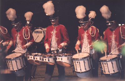 The Jacksonville State University Marching Southerners perform during a Fall 1993 performance, possibly a band exhibition performance. The band was under the direction of Dr. Scott McBride and the field direction of drum majors Keith Casey and Marcus LeGear. (circa Fall 1993)