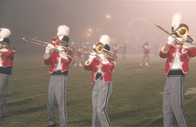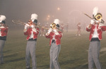 The Jacksonville State University Marching Southerners perform during a Fall 1993 performance, possibly a band exhibition performance. The band was under the direction of Dr. Scott McBride and the field direction of drum majors Keith Casey and Marcus LeGear. (circa Fall 1993)
