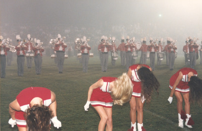 The Jacksonville State University Marching Southerners perform during a Fall 1993 performance, possibly a band exhibition performance. The band was under the direction of Dr. Scott McBride and the field direction of drum majors Keith Casey and Marcus LeGear. (circa Fall 1993)