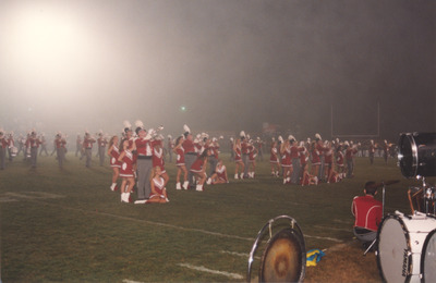 The Jacksonville State University Marching Southerners perform during a Fall 1993 performance, possibly a band exhibition performance. The band was under the direction of Dr. Scott McBride and the field direction of drum majors Keith Casey and Marcus LeGear. (circa Fall 1993)