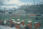 The Jacksonville State College (now Jacksonville State University) Southerners Marching band and ballerinas take the field for a performance. Members of a guest band kneel to watch from the sidelines. (circa 1962) [courtesy of Joe David Walters]