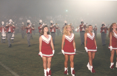 The Jacksonville State University Marching Southerners perform during a Fall 1993 performance, possibly a band exhibition performance. The band was under the direction of Dr. Scott McBride and the field direction of drum majors Keith Casey and Marcus LeGear. (circa Fall 1993)