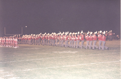 The Jacksonville State University Marching Southerners perform during a Fall 1993 performance, possibly a band exhibition performance. The band was under the direction of Dr. Scott McBride and the field direction of drum majors Keith Casey and Marcus LeGear. (circa Fall 1993)