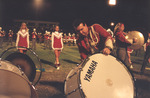 The Jacksonville State University Marching Southerners perform during a Fall 1993 performance, possibly a band exhibition performance. The band was under the direction of Dr. Scott McBride and the field direction of drum majors Keith Casey and Marcus LeGear. (circa Fall 1993)