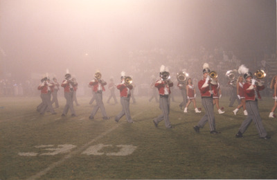 The Jacksonville State University Marching Southerners perform during a Fall 1993 performance, possibly a band exhibition performance. The band was under the direction of Dr. Scott McBride and the field direction of drum majors Keith Casey and Marcus LeGear. (circa Fall 1993)