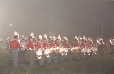 The Jacksonville State University Marching Southerners perform during a Fall 1993 performance, possibly a band exhibition performance. The band was under the direction of Dr. Scott McBride and the field direction of drum majors Keith Casey and Marcus LeGear. (circa Fall 1993)
