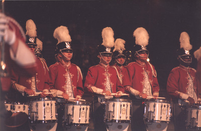 The Jacksonville State University Marching Southerners perform during a Fall 1993 performance, possibly a band exhibition performance. The band was under the direction of Dr. Scott McBride and the field direction of drum majors Keith Casey and Marcus LeGear. (circa Fall 1993)