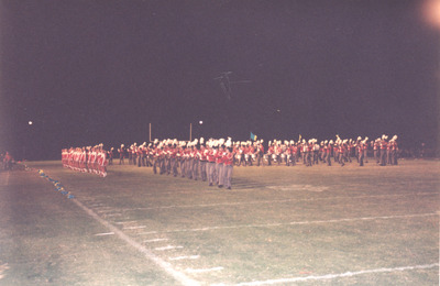 The Jacksonville State University Marching Southerners perform during a Fall 1993 performance, possibly a band exhibition performance. The band was under the direction of Dr. Scott McBride and the field direction of drum majors Keith Casey and Marcus LeGear. (circa Fall 1993)