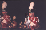 The Jacksonville State University Marching Southerners perform during a Fall 1993 performance, possibly a band exhibition performance. The band was under the direction of Dr. Scott McBride and the field direction of drum majors Keith Casey and Marcus LeGear. (circa Fall 1993)