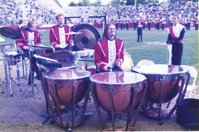 The Jacksonville State University Marching Southerners and Ballerinas perform during a Fall 1995 performance, possibly a football game held in the Paul Snow Stadium in Jacksonville, AL. The 1995 show opener was "Carmina Burana," the ballerina tune was "Lulu's Back in Town," the ballad was "Simple Song at Sunrise," and the closer was "Malaguena." The band was under the direction of Kenneth G. Bodiford. (circa October 1995)