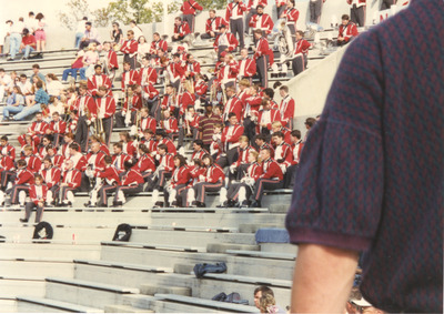 The Jacksonville State University Marching Southerners and Ballerinas sit in the stadium stands during a Fall 1995 football game in the Paul Snow Stadium in Jacksonville, AL. The 1995 show opener was "Carmina Burana," the ballerina tune was "Lulu's Back in Town," the ballad was "Simple Song at Sunrise," and the closer was "Malaguena." The band was under the direction of Kenneth G. Bodiford.