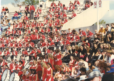 The Jacksonville State University Marching Southerners and Ballerinas sit in the stadium stands during a Fall 1995 football game in the Paul Snow Stadium in Jacksonville, AL. The 1995 show opener was "Carmina Burana," the ballerina tune was "Lulu's Back in Town," the ballad was "Simple Song at Sunrise," and the closer was "Malaguena." The band was under the direction of Kenneth G. Bodiford.