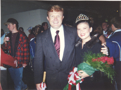 Kerri Bentley was crowned Miss JSU on January 14, 1995 at Jacksonville State University. She was a Marching Ballerina, a Zeta Tau Alpha sister, and a member of Campus Outreach. Shown she stands with Ken Bodiford, Director of Bands. (circa 1995)