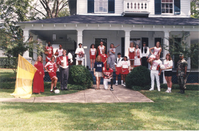 Members of various organizations, sports, and activities are shown in uniforms outside the Alumni House at Jacksonville State University. (circa 1997)