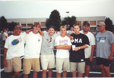Members of the Jacksonville State University Marching Southerners stand together during band camp or rehearsal in the Pete Mathews Coliseum parking lot. (circa August 23, 2000)