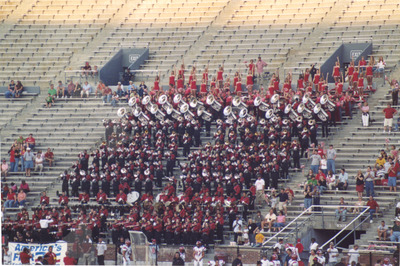 The Jacksonville State University Marching Southerners and Ballerinas perform from the stadium stands during an away football game. The 2005 show title was "Muy Caliente," the opener was "Firedance," the ballerina tune was "Fever," the ballad was "Fire of Eternal Glory," and the closer was "New World Symphony." The band was under the direction of Kenneth G. Bodiford. (circa September 19, 2005)