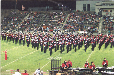 The Jacksonville State University Marching Southerners and Ballerinas perform on the field during an away performance. The 2005 show title was "Muy Caliente," the opener was "Firedance," the ballerina tune was "Fever," the ballad was "Fire of Eternal Glory," and the closer was "New World Symphony." The band was under the direction of Kenneth G. Bodiford. (circa September 25, 2005)