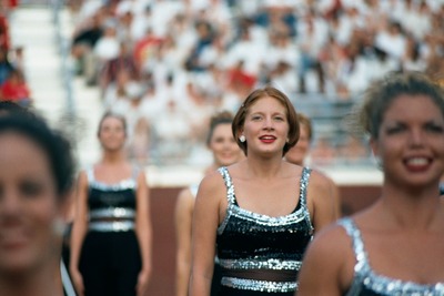The Jacksonville State University Marching Southerners perform during a Fall 2000 performance, possibly a band exhibition performance at Tuscaloosa County High School in Northport, AL. The 2000 show title was "A Night in Birdland." Opener was "Birdland," the ballerina tune was "Night in Tunisia/Harlem Nocturne," and the closer was "Strawberry Soup." The band was under the direction of Kenneth G. Bodiford. Shown are ballerinas. (before October 2000)