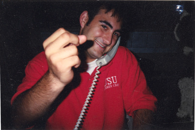 A male individual dressed in a JSU summer camp polo shirt talks on a telephone. (circa 1996 or after)