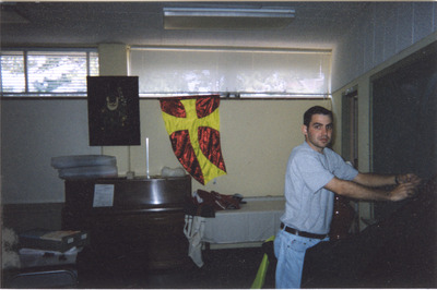 A male individual stands inside a classroom. (circa 1996)
