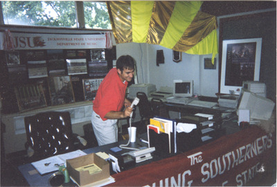 A male individual dressed in a JSU summer camp polo shirt puts down a telephone. (circa 1996 or after)