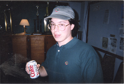 A male individual stands inside an office or classroom with trophies in the background. (circa 1996 or after)